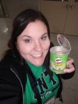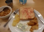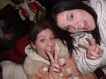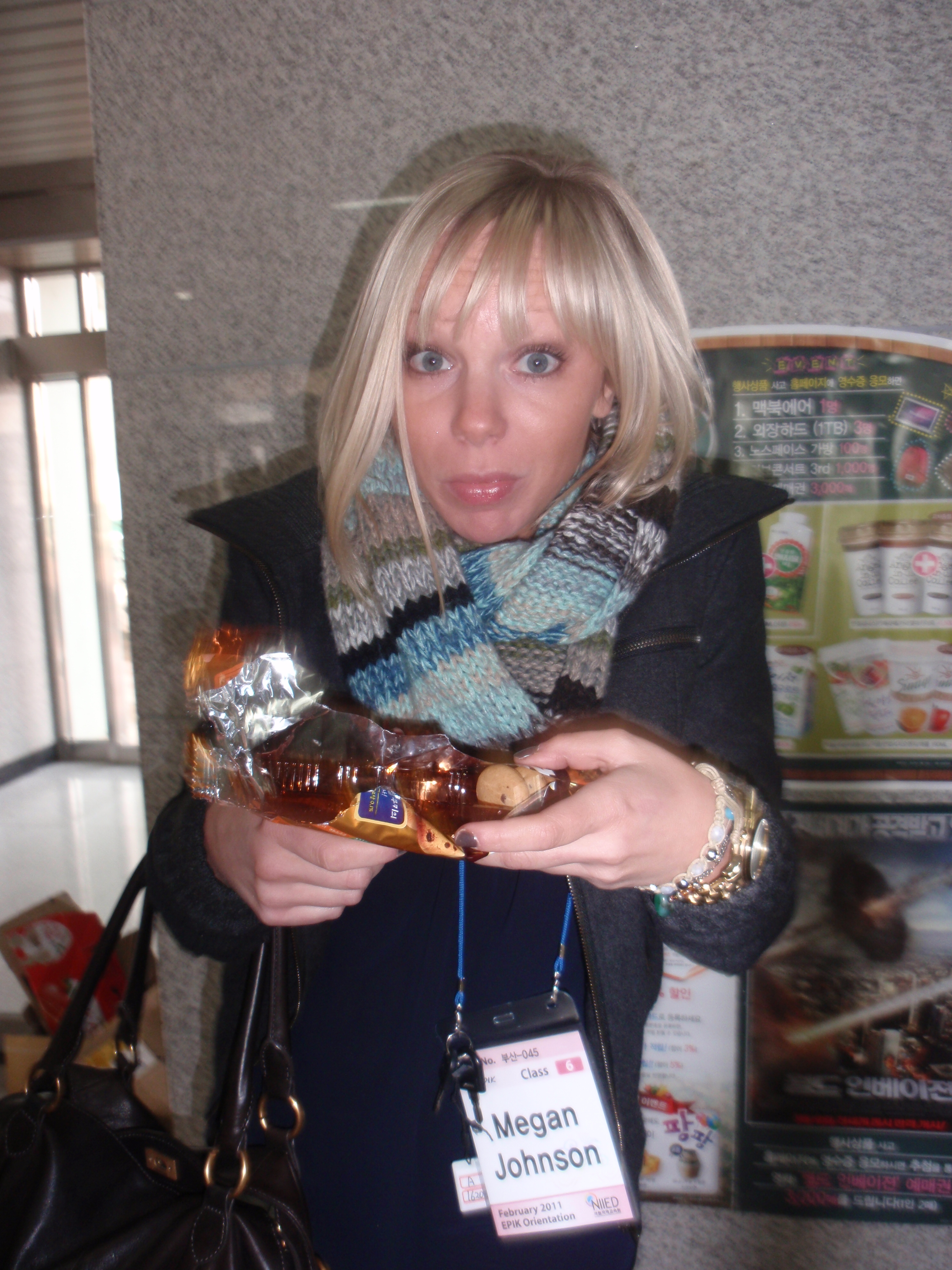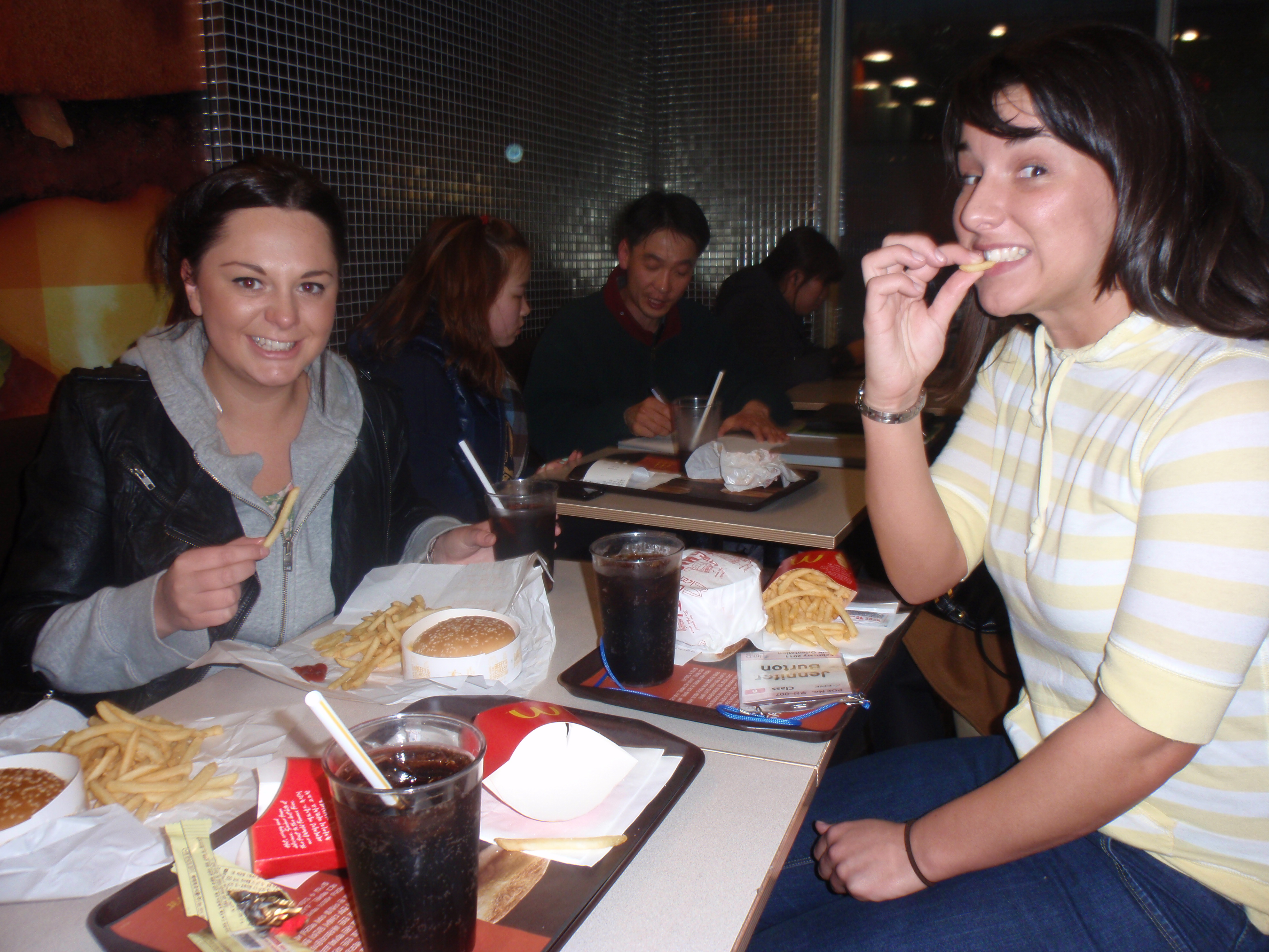 A very typical breakfast for me was toast with butter and strawberry jelly. Sometimes I would eat cereal also. The second picture above is lunch. I think on this day I really just ate oranges. Some of us went down to the convenience store on the first floor and got snacks. Here’s Megan and I with our snacks…