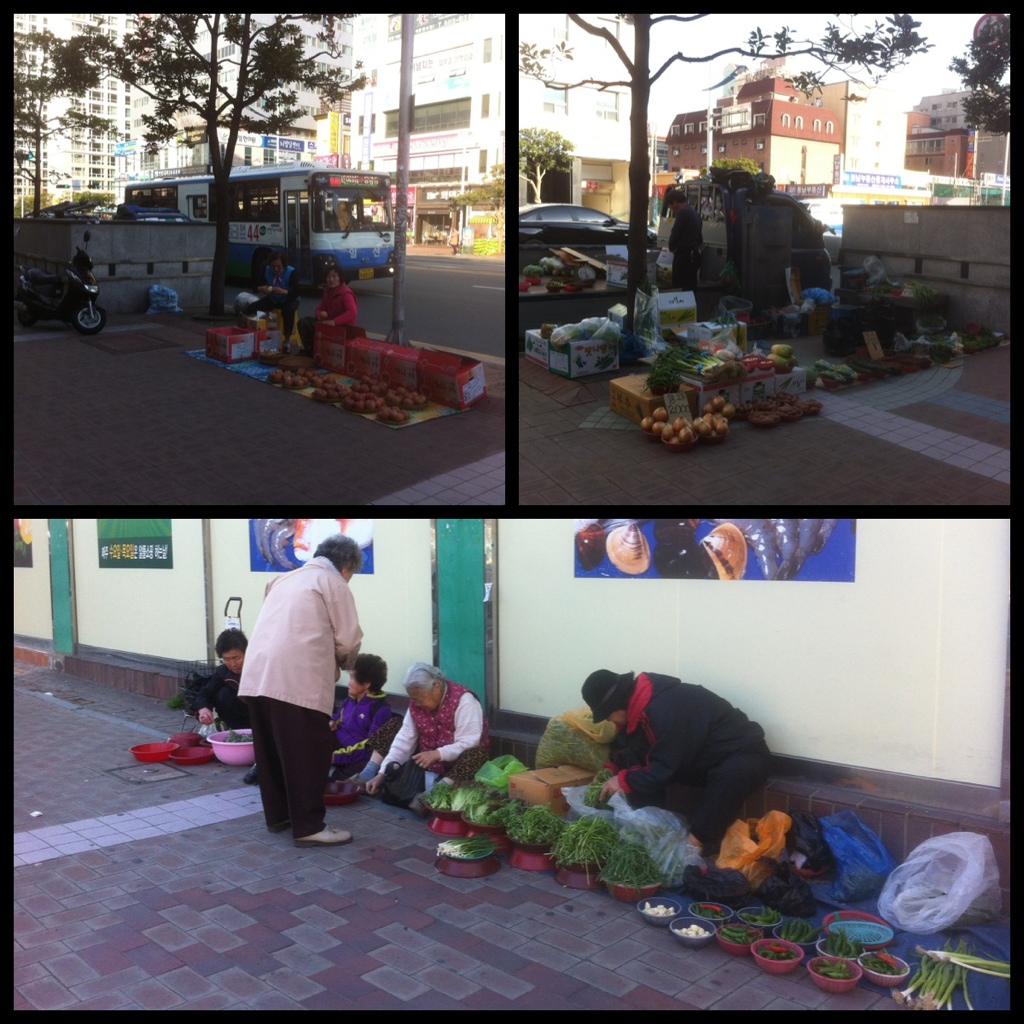 It’s pretty common to find people selling fruits and vegetables on the street in Korea. These photos were all taken today in my neighborhood. Each photo was taken on the same block… The bottom photo was actually taken right in front of a grocery store.