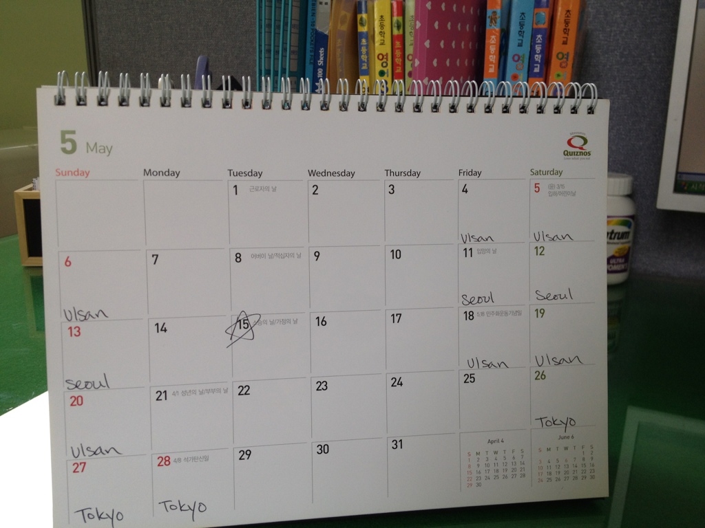 May just may be my busiest month in Korea yet. Dave’s parents are visiting from Australia so I’m heading up to Ulsan. Next weekend we are all going to Seoul. My birthday is on the 15th so Dave has graciously offered to have some friends over. And finally, the following weekend is a long weekend thanks to the Korean celebration of Buddha’s birthday so Dave and I are going to Tokyo.