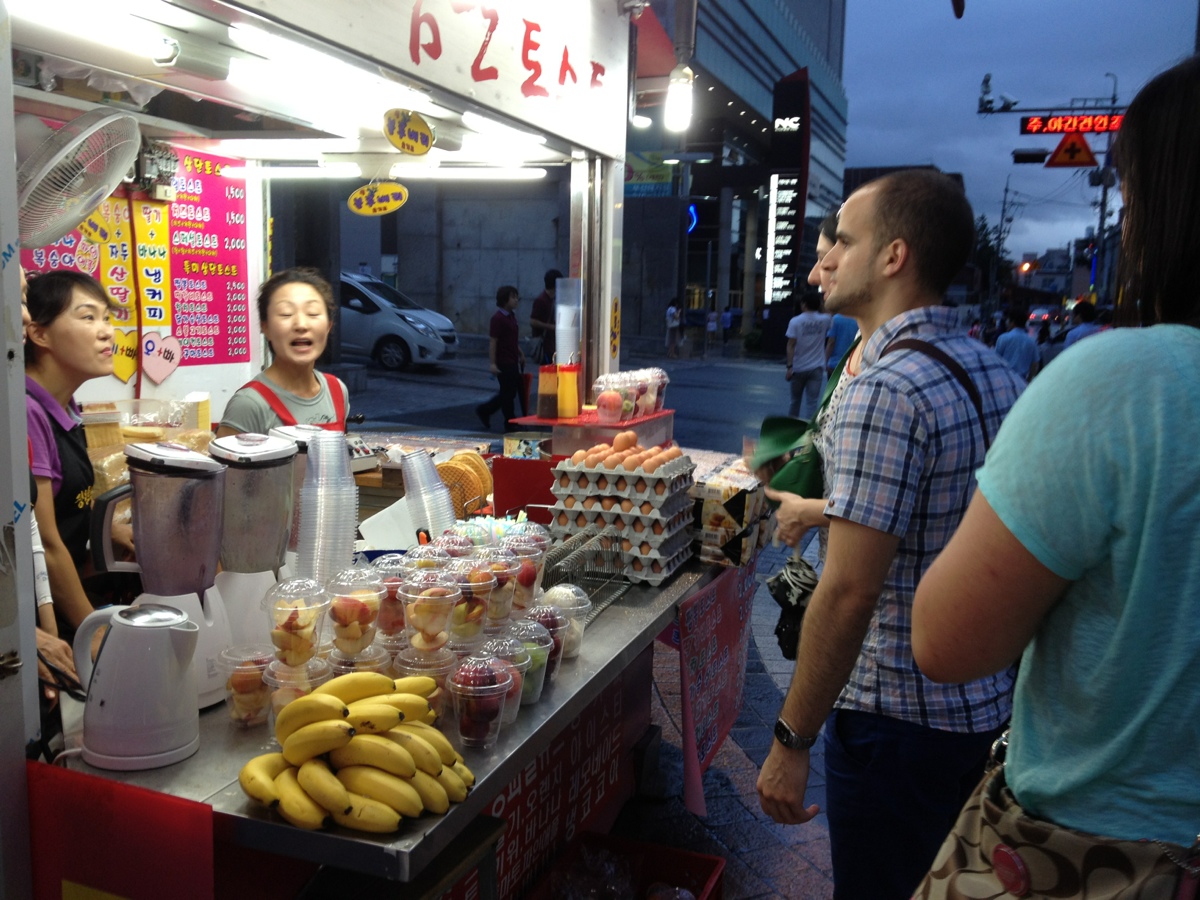 I met up with Jami, Shanna and Matt in PNU after work on Wednesday. We had Japanese ramen and afterwards we stopped here for a smoothie. Places like this are very common. The fruit for the smoothies is pre portioned out in cups. You just pick a cup and they make you a delicious smoothie. This stand also sells waffles and they gave us a free one. They spread whipped cream and honey on it and then fold it over. They are quite tasty.