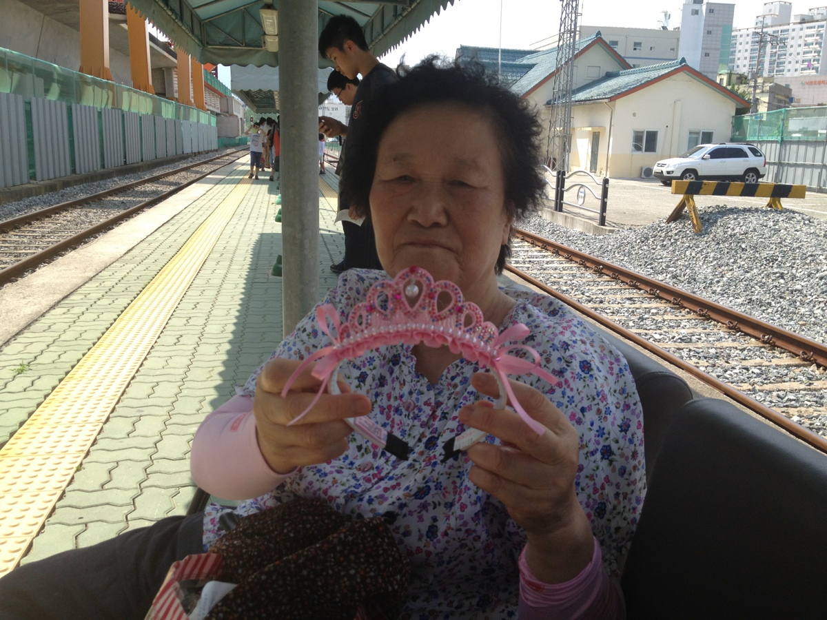 Afterwards, I caught a ride to the train station from another teacher. I got to the train station earlier than I anticipated and it was just in time to catch the next train. As I was waiting for my train, I met this woman. She sat down next to me and started telling me (in Korean) about the headband she’s holding in the picture. She said it was beautiful and I’m pretty sure she said it was 4,000 won, but she got it for 2,000. I told her (in Korean) “Beautiful. This.” and mimicked taking a picture with my hands. She dug the headband back out of her purse and posed for my picture.