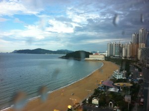 It rained all night, but the skies cleared up by morning. This was the view of Haeundae Beach from our hotel room in Busan.
