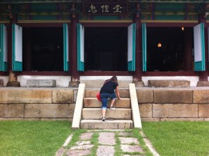 We took the subway to a stop called Suwon, then walked through the outdoor street market. Joni wasn’t too impressed and the smells of the oriental spices made her sick to her stomach. We continued walking and came across a museum. Joni’s short legs had a difficult time on the big steps.