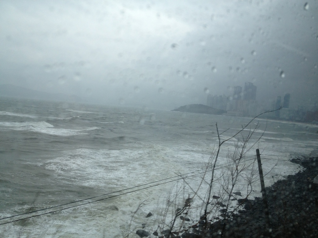 This weekend we had a going away party for 3 of my teacher friends that leave Korea in a few weeks. I took the train from Ulsan to Busan on Friday afternoon. The weather was really crappy, but I enjoyed the view on the train when we approached Busan. The wind was really strong and there were actually waves in the sea. You just don’t see that here. I took several photos, but I liked this one with a bit of the Busan skyline in the background.