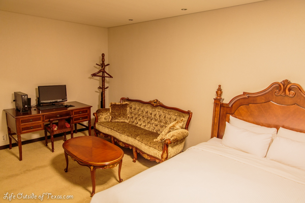 We recently went on a major road trip on a mission to visit Nami Island, which is in the far northern part of Korea and very far from Ulsan. The night before leaving we booked the Benikea Hotel (short for Best Night in Korea) in Wonju. Because we waited until the last minute, we had to book a “luxury” room for 10,000 won (about $10) more. When we got up to the rooms, we both had a laugh because the room looked like someone from our grandmothers’ generations could have been the decorator. Most hotels in Korea go for the ultra modern look, but this one had a giant vintage sofa, antique wooden furniture and to top it all off, there was a full desktop computer set up in the room. If I didn’t already know that Korea has the fastest internet in the world, I would have expected to hear the shrill sound of a dial-up modem when trying to connect to the internet.