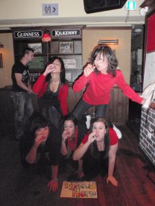 Bonus Challenge: All 5 team members must do a human pyramid and take a shot at the same time