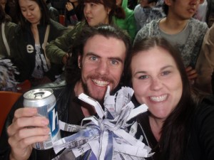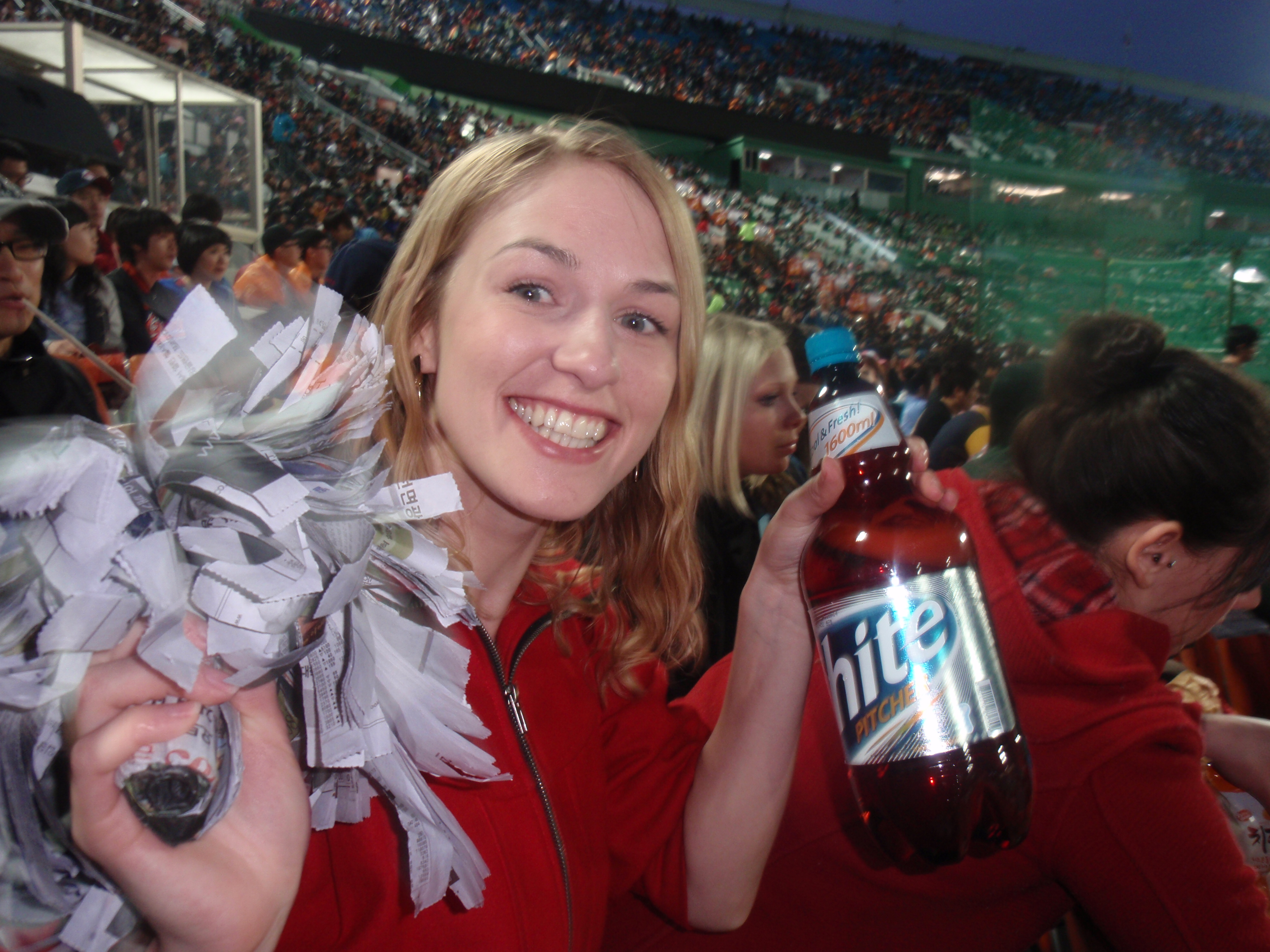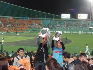 Another thing that’s quite popular are these newspaper pom-poms. People tear up newspaper and make pom-poms out of them. This one was generously given to us by a friendly Korean at the game.