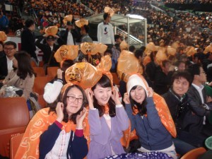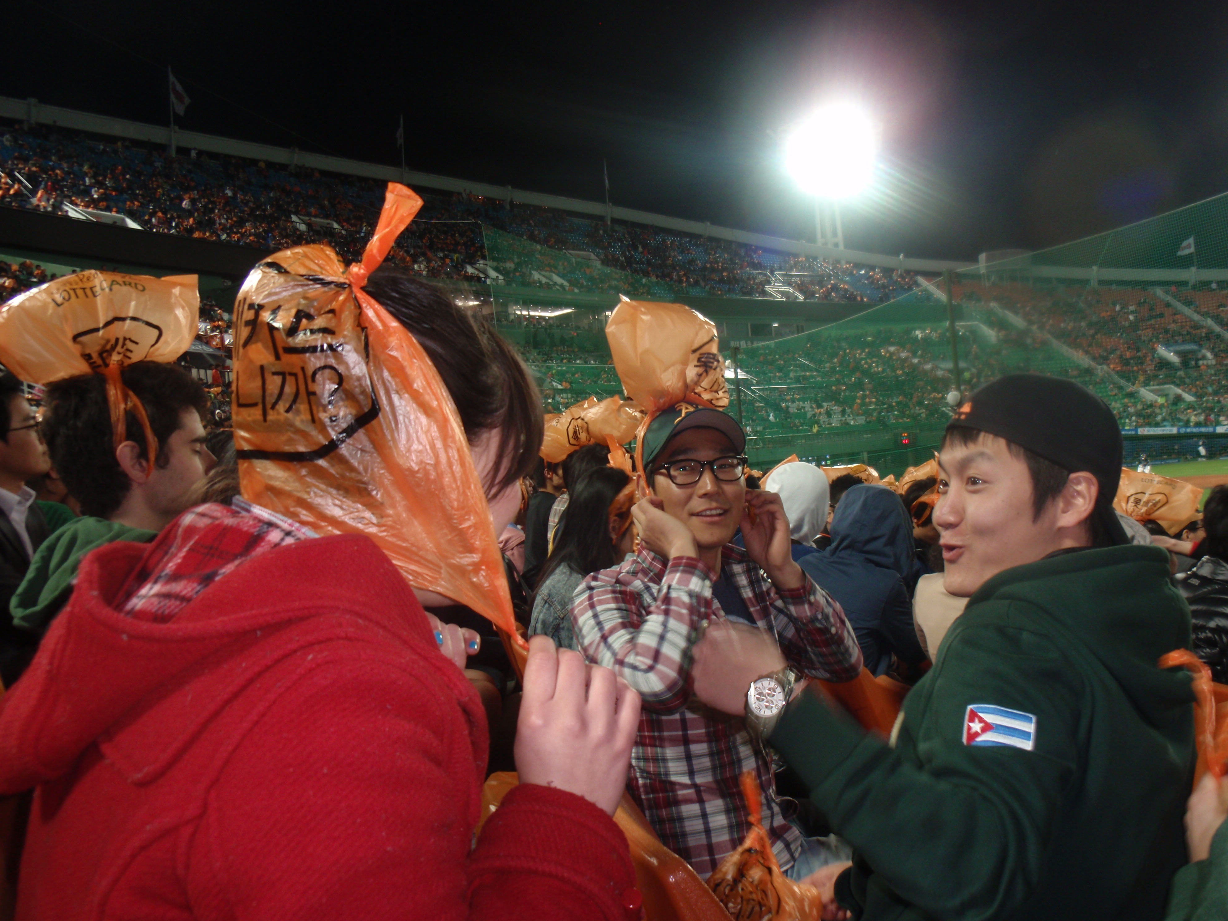 You might be wondering why everyone’s putting orange sacks on their heads… you are, right? Towards the end of the game, they pass out these sacks so everyone can put their trash in them to make it easier for the clean up crews after the game. Somehow people decided to make hats out of them and wear them until they were ready to dispose of their waste. It caught on and now it’s just a thing you do at Lotte Giants games.